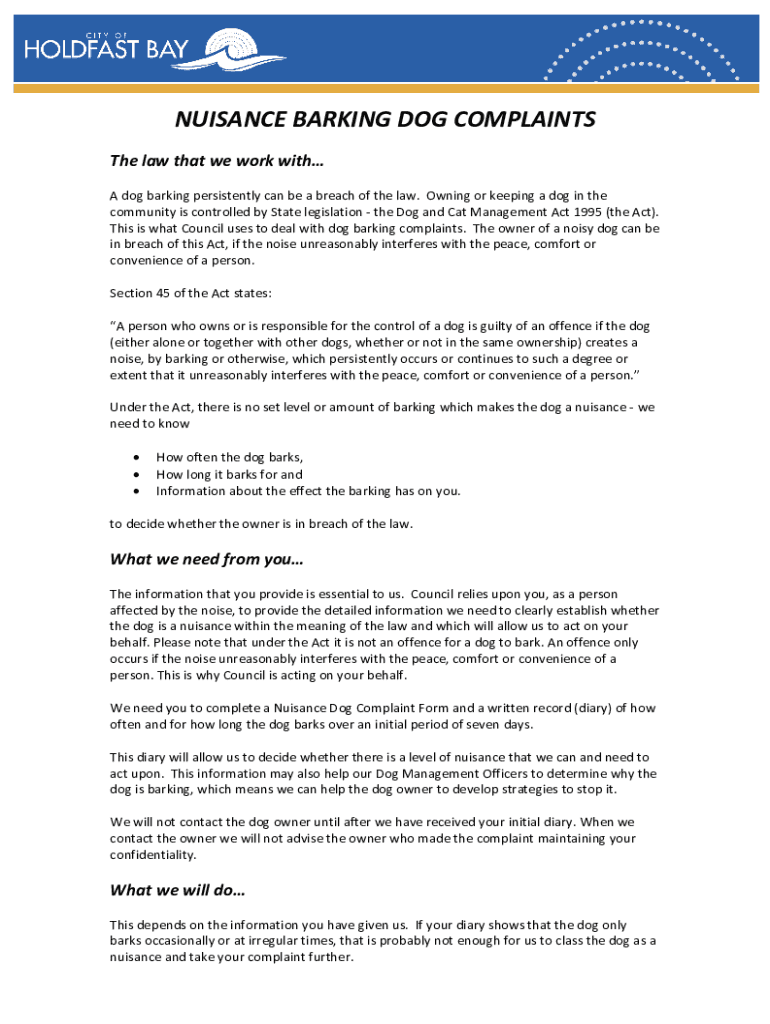 NUISANCE BARKING DOG COMPLAINTS The law that we work with A dog barking persistently can be a breach of the law. Owning or keeping a dog in the community is controlled by State legislation the Dog