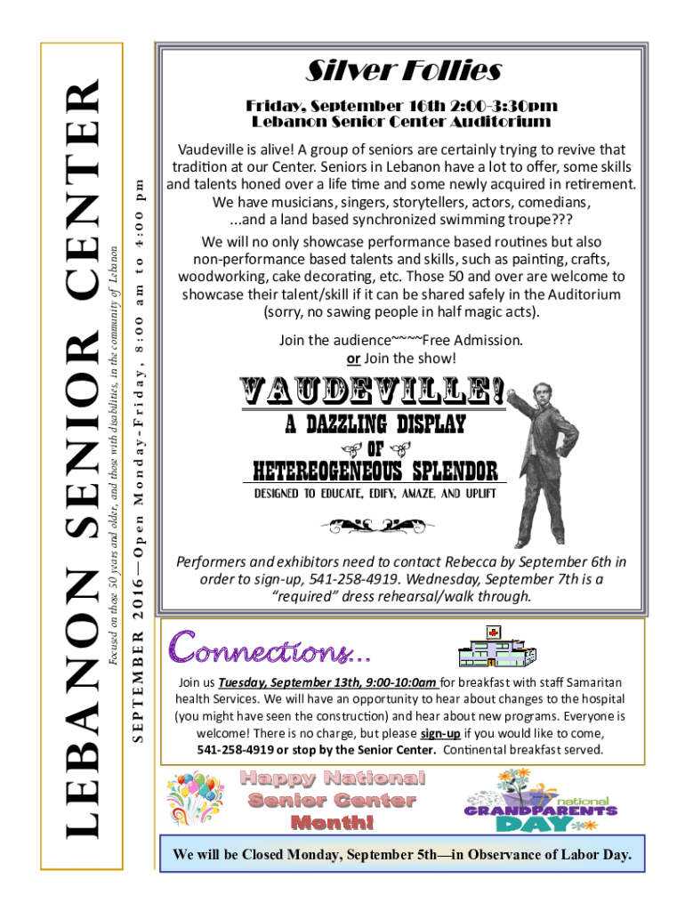 SEPTEMBER 2016Open Monday Friday, 8:00 am to 4:00 pm Friday, September 16th 2:003:30pm Lebanon Senior Center AuditoriumFocused on those 50 years and older, and those with disabilities, in the community