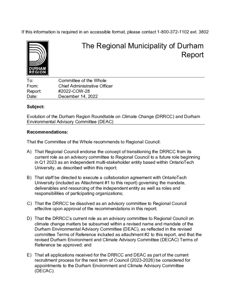 If this information is required in an accessible format, please contact 18003721102 ext. 3802The Regional Municipality of Durham Report To: From: Report: Date:Committee of the Whole Chief Administrative