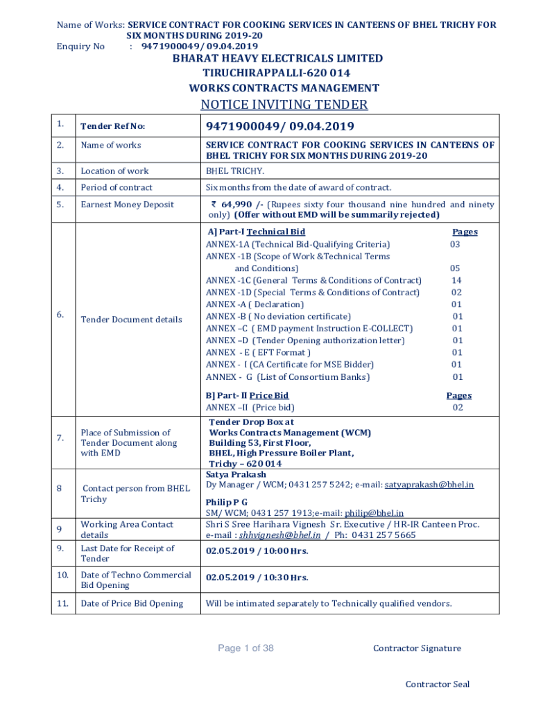 Get the free Name of Works: SERVICE CONTRACT FOR COOKING SERVICES IN CANTEENS OF BHEL TRICHY FOR