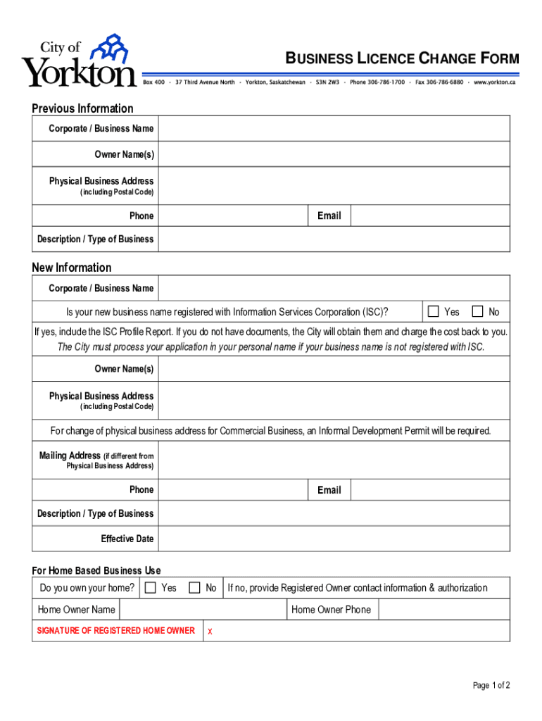 BUSINESS License CHANGE FORM Previous Information Corporate / Business Name Owner Name(s) Physical Business Address (including Postal Code)Smartphone Description / Type of Businesses Information Corporate