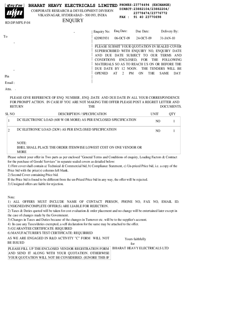 Get the free BHEL Enq No 620903931 for Electronic DC Load.PDF