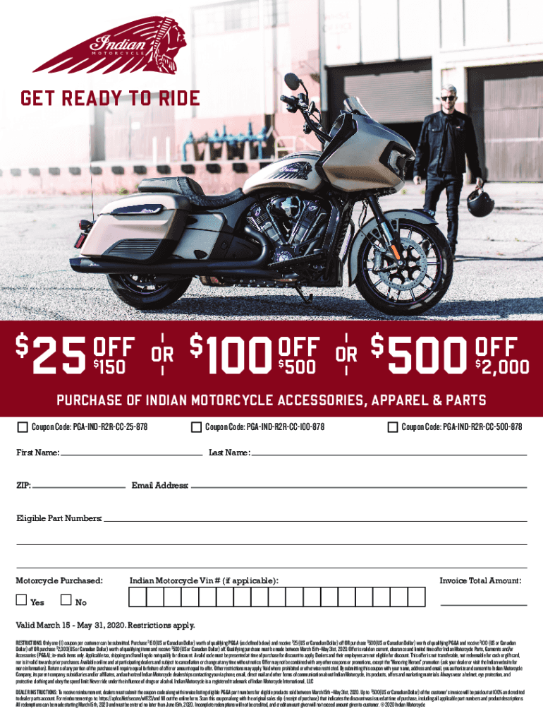 GET READY TO RIDE$25OFF $ 150OR$100OFF $ 500OR$500OFF $2,000PURCHASE OF INDIAN MOTORCYCLE ACCESSORIES, APPAREL & PARTS Coupon Code: PGAINDR2RCC25878Coupon Code: PGAINDR2RCC100878Coupon Code: PGAINDR2RCC500878First