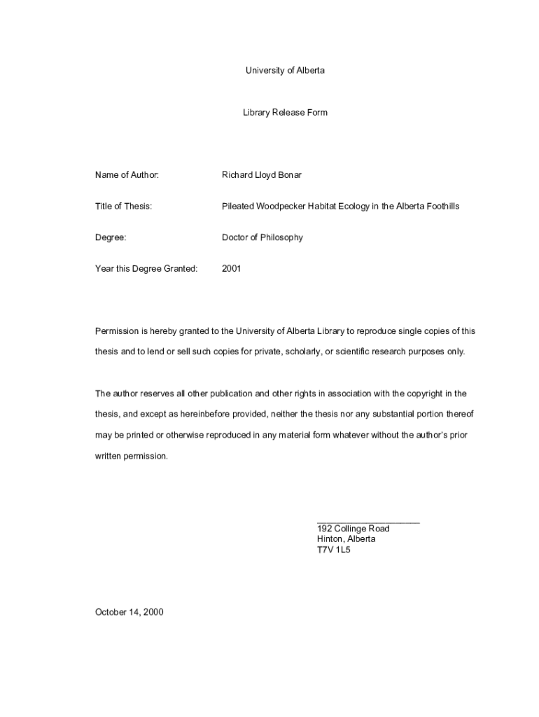 University of AlbertaLibrary Release Forename of Author:Richard Lloyd Bipartite of Thesis:Pleated Woodpecker Habitat Ecology in the Alberta FoothillsDegree:Doctor of Philosopher this Degree Granted:2001Permission