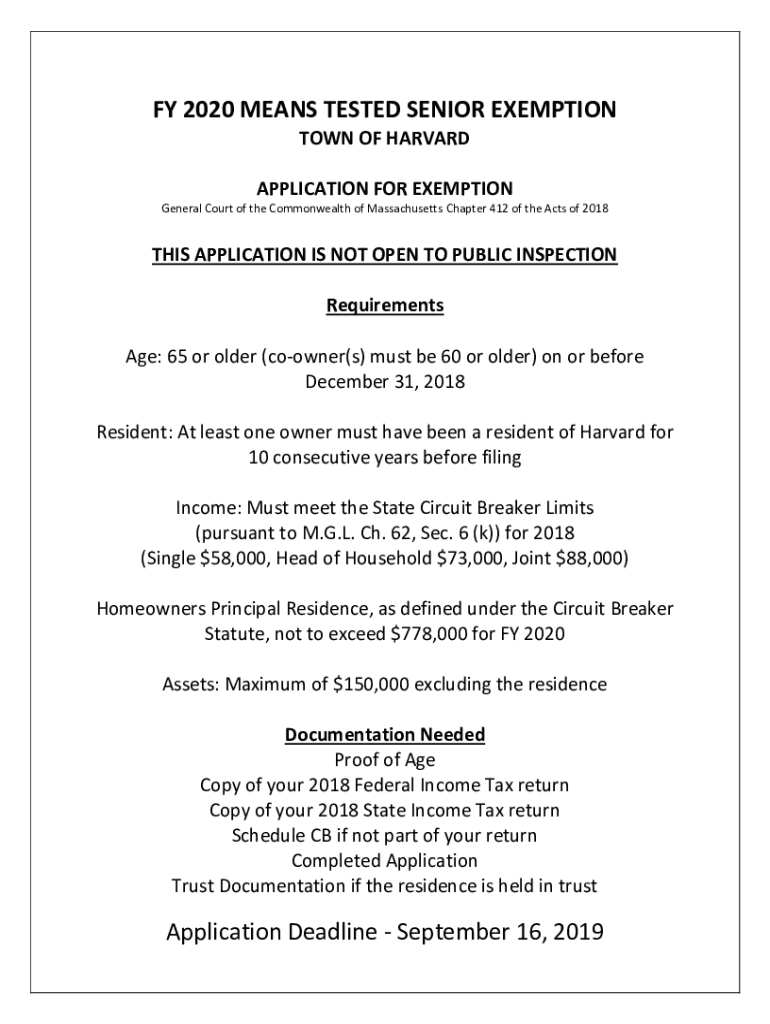 FY 2020 MEANS TESTED SENIOR EXEMPTION TOWN OF HARVARD APPLICATION FOR EXEMPTION General Court of the Commonwealth of Massachusetts Chapter 412 of the Acts of 2018THIS APPLICATION IS NOT OPEN TO PUBLIC