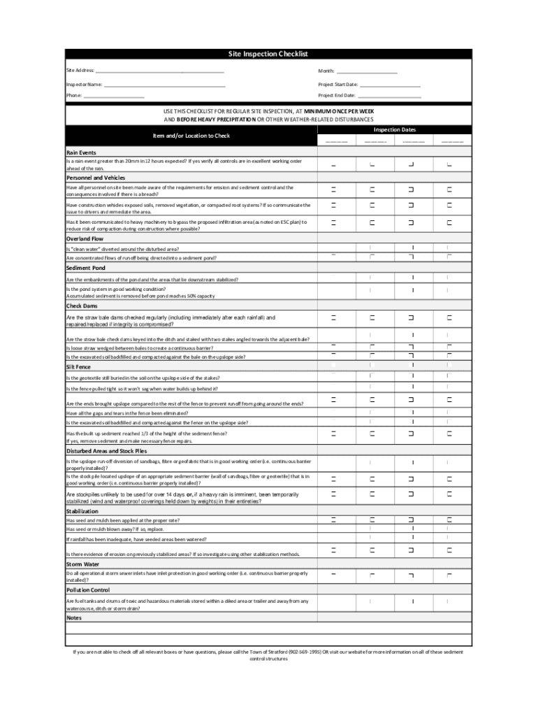 Site Inspection Checklist Site Address: ___Month: ___Inspector Name: ___Project Start Date: ___Phone: ___Project End Date: ___USE THIS CHECKLIST FOR REGULAR SITE INSPECTION, AT MINIMUM ONCE PER WEEK