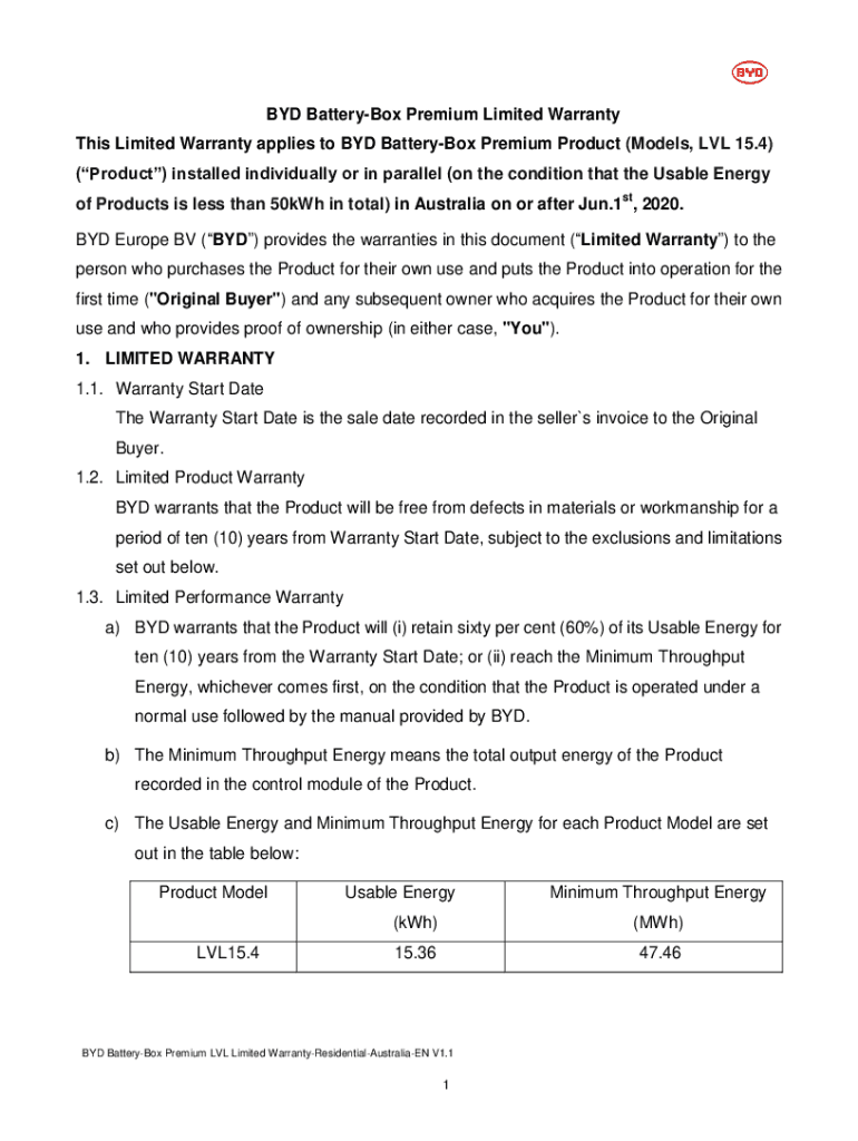 BYD Battery Premium Limited Warranty This Limited Warranty applies to BYD Battery Premium Product (Models, LVL 15.4) (Product) installed individually or in parallel (on the condition that the Usable