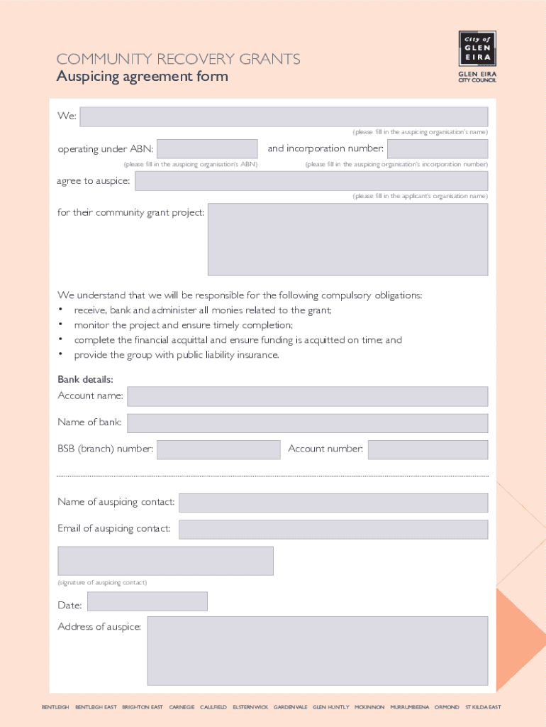 COMMUNITY RECOVERY GRANTS Au spicing agreement form We: (please fill in the aspiring organizations name)and incorporation number:operating under ABN: (please fill in the aspiring organizations ABN)(please