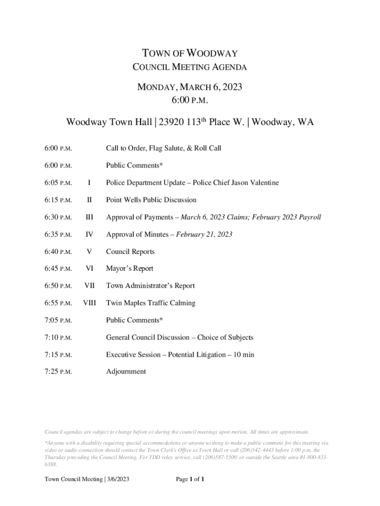 TOWN OF ROADWAY COUNCIL MEETING AGENDA MONDAY, MARCH 6, 2023 6:00 P.M. Wood way Town Hall | 23920 113th Place W. | Wood way, WA 6:00 P.M. Call to Order, Flag Salute, & Roll Call6:00 P.M. Public Comments×6:05
