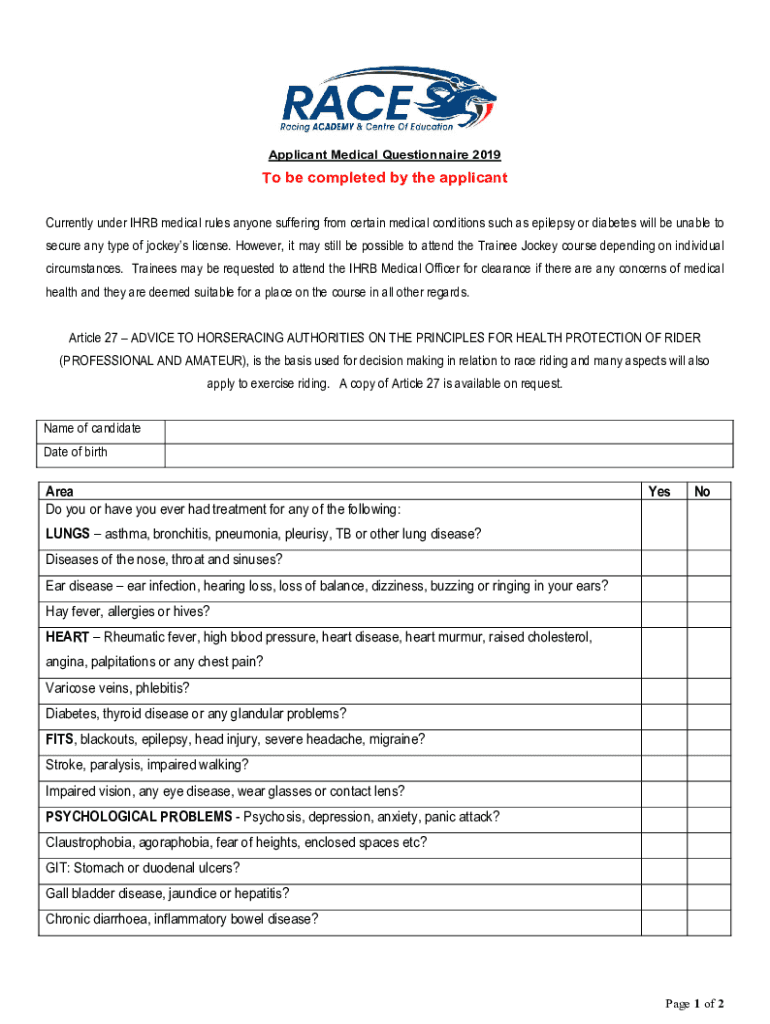 Applicant Medical Questionnaire 2019To be completed by the applicant Currently under HRB medical rules anyone suffering from certain medical conditions such as epilepsy or diabetes will be unable