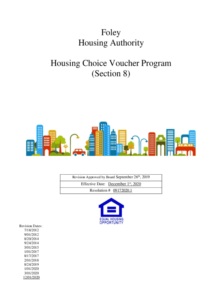 Foley Housing Authority Housing Choice Voucher Program (Section 8)Revision Approved by Board September 26th, 2019Effective Date: December 1st, 2020 Resolution # 09172020.1Revision Dates: 7/18/2012