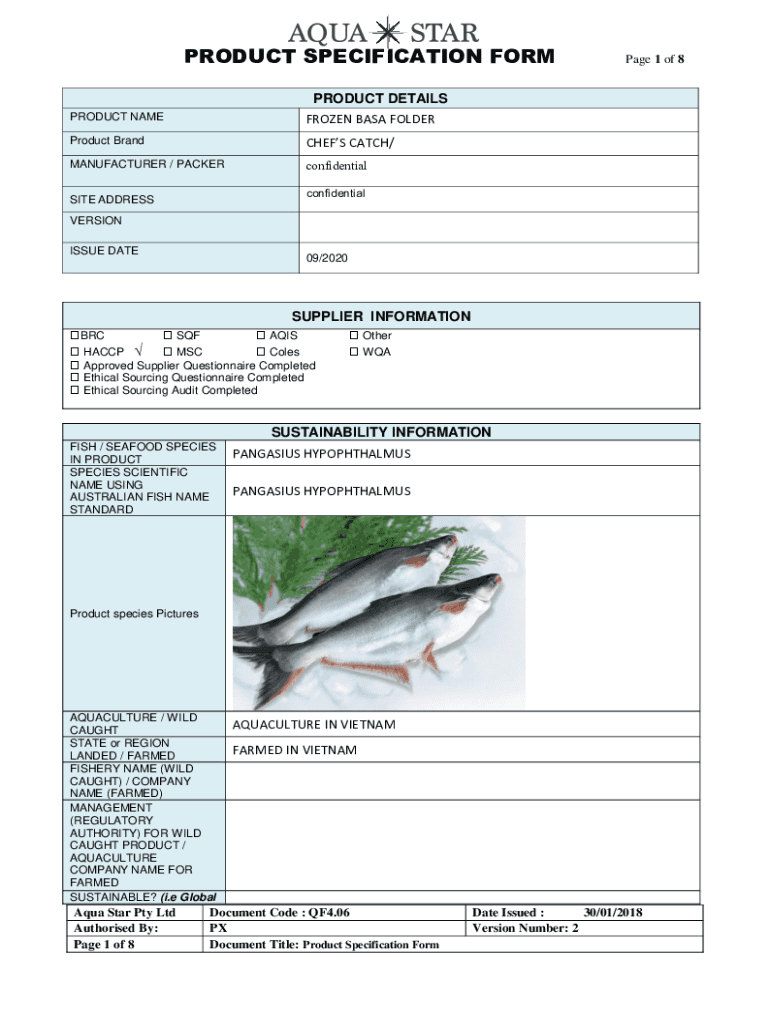 PRODUCT SPECIFICATION FORM PRODUCT NAMEPRODUCT DETAILS FROZEN BASE FOLDERProduct Branches CATCH/MANUFACTURER / PACKERconfidentialSITE ADDRESSconfidentialPage 1 of 8VERSION ISSUE DATE09/2020SUPPLIER