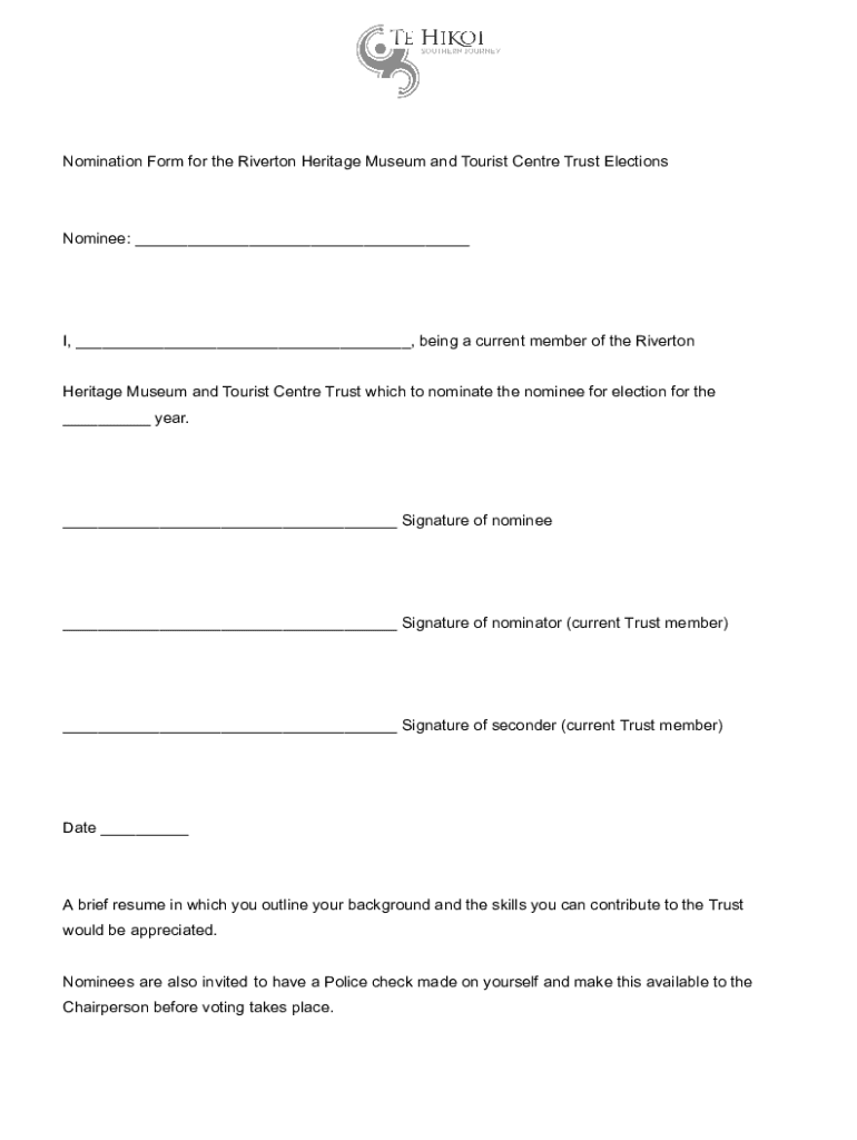 Nomination Form for the Riverton Heritage Museum and Tourist Center Trust ElectionsNominee: ___I, ___, being a current member of the Riverton