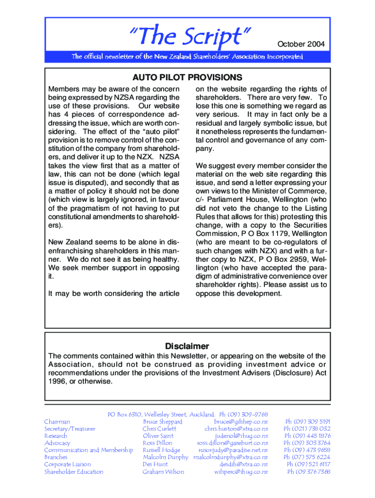 The Script October 2004The official newsletter of the New Zealand Shareholders Association IncorporatedAUTO PILOT PROVISIONS Members may be aware of the concern being expressed by NASA regarding the