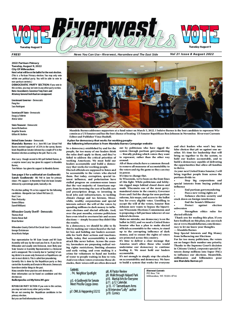 Tuesday August 9Tuesday August 9FREE! News You Can Use River west, Harambee and The East Side 21 Issue 8 August 20222022 Partisan Primary Tuesday, August 9, 2022, City Of Milwaukee Here's what will