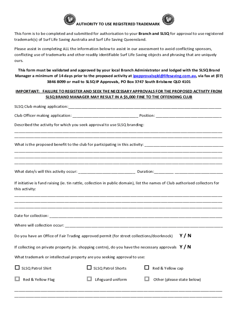 AUTHORITY TO USE REGISTERED TRADEMARK This form is to be completed and submitted for authorization to your Branch and SLS for approval to use registered trademark(s) of Surf Life Saving Australia
