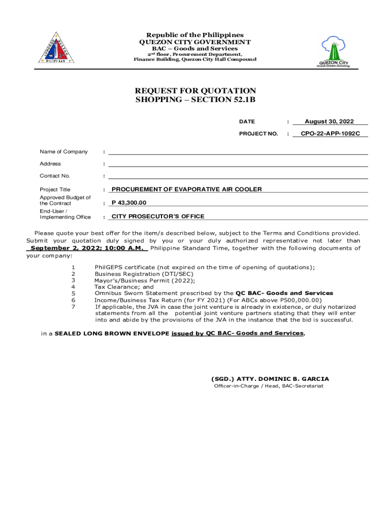 Finance Building, Quezon City Hall CompoundREQUEST FOR QUOTATION