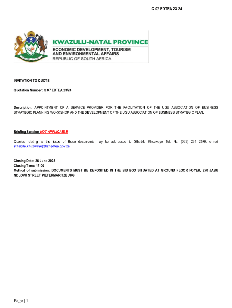 Q 07 EDTA 2324INVITATION TO QUOTE Quotation Number: Q 07 EDTA 23/24Description: APPOINTMENT OF A SERVICE PROVIDER FOR THE FACILITATION OF THE UGU ASSOCIATION OF BUSINESS STRATEGIC PLANNING WORKSHOP