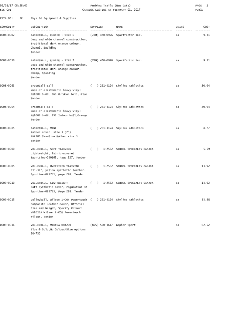 02/01/17 08:28:00Pembina Trails (New Data)SDS GUI CATALOG:PAGECATALOG LISTING AT FEBRUARY 01, 2017 PE1PUR1VPhys Ed Equipment & SuppliesCOMMODITYDESCRIPTIONSUPPLIERNAMEUNITSCOST00080002BASKETBALL,