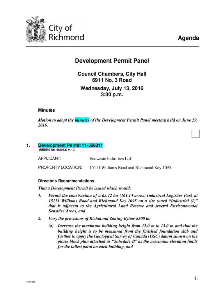 AgendaDevelopment Permit Panel Council Chambers, City Hall 6911 No. 3 Road Wednesday, July 13, 2016 3:30 p.m. Minutes Motion to adopt the minutes of the Development Permit Panel meeting held on June