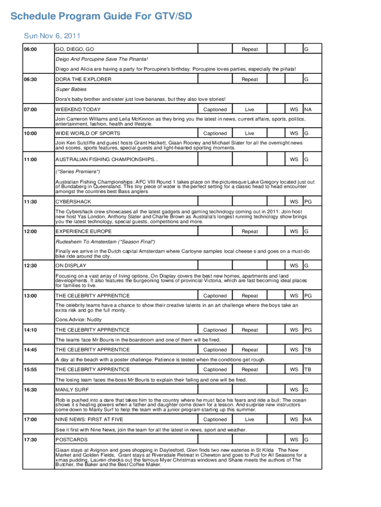 Schedule Program Guide For MTV/SD Sun Nov 6, 2011 06:00GO, DIEGO, GORepeatGDeigo And Porcupine Save The Pinata! Diego and Alicia are having a party for Porcupine\'s birthday. Porcupine loves parties,