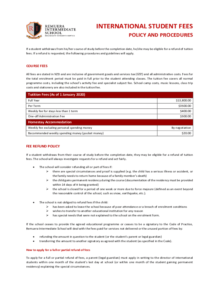 INTERNATIONAL STUDENT FEES POLICY AND PROCEDURES If a student withdraws from his/her course of study before the completion date, he/she may be eligible for a refund of tuition fees. If a refund is