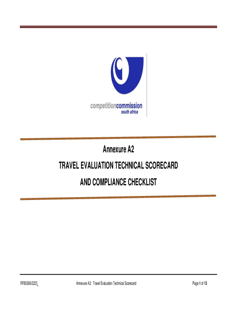 Appendix A2 TRAVEL EVALUATION TECHNICAL SCORECARD AND COMPLIANCE CHECKLISTRFB0306/2223Annexure A2: Travel Evaluation Technical Scorecard Page 1 of 13ANNEXURE A2: TRAVEL EVALUATION TECHNICAL SCORECARD