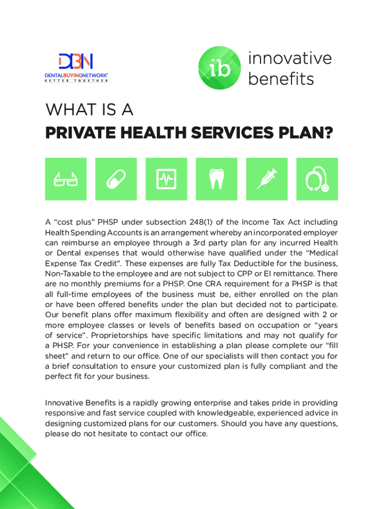 WHAT IS A PRIVATE HEALTH SERVICES PLAN? A cost plus PSP under subsection 248(1) of the Income Tax Act including Health Spending Accounts is an arrangement whereby an incorporated employer can reimburse
