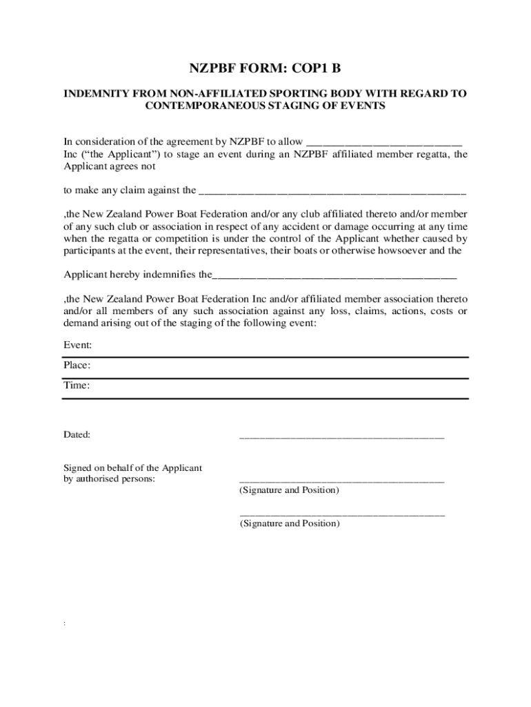 NBF FORM: COP1 B INDEMNITY FROM UNAFFILIATED SPORTING BODY WITH REGARD TO CONTEMPORANEOUS STAGING OF EVENTS In consideration of the agreement by NBF to allow ___ Inc (the Applicant) to stage an event