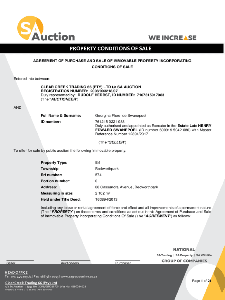 PROPERTY CONDITIONS OF SALE AGREEMENT OF PURCHASE AND SALE OF IMMOVABLE PROPERTY INCORPORATING CONDITIONS OF SALE Entered into between: CLEAR CREEK TRADING 66 (PTY) LTD t/a SA AUCTION REGISTRATION