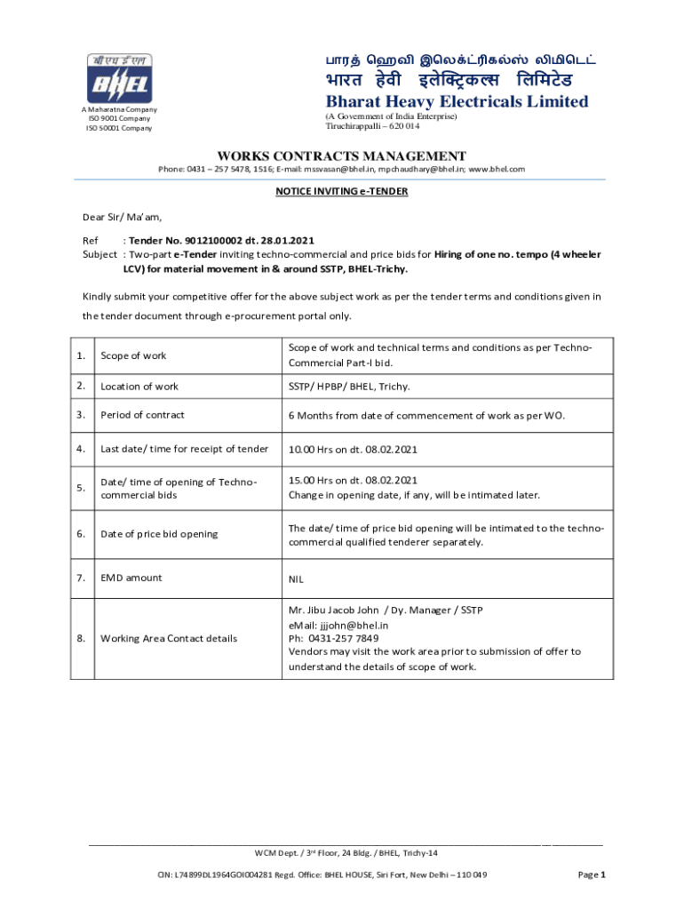 Bharat Heavy Electrical Limited Mahayana Company ISO 9001 Company ISO 50001 Company(A Government of India Enterprise) Tiruchirappalli 620 014WORKS CONTRACTS MANAGEMENT Phone: 0431 257 5478, 1516;