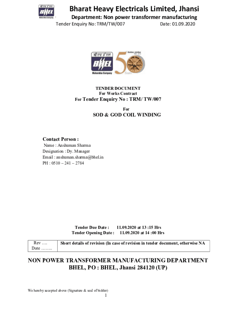 Bharat Heavy Electrical Limited, Jhansi Department: Non-power transformer manufacturing Tender Inquiry No: TRM/TW/007Date: 01.09.2020TENDER DOCUMENT For Works Contract For Tender Inquiry No : TRM/