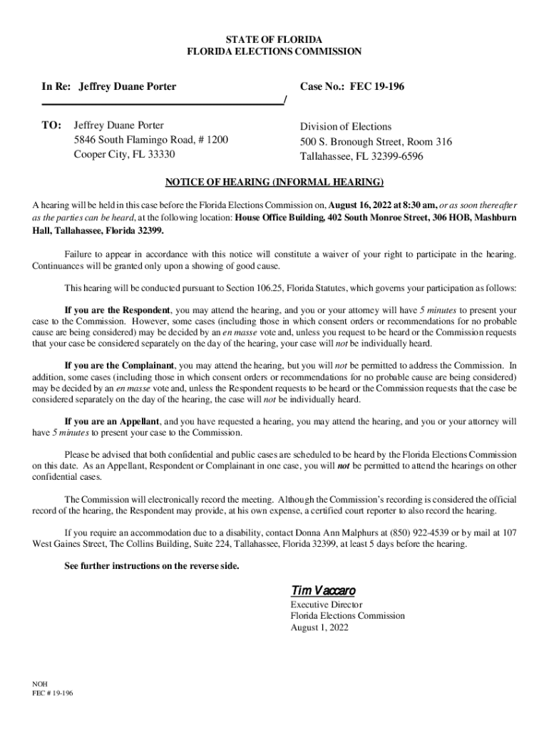 STATE OF FLORIDA ELECTIONS Commissioning Re: Jeffrey Duane Porter ___/Case No.: FEC 19196TO:Division of Elections 500 S. Borough Street, Room 316 Tallahassee, FL 323996596Jeffrey Duane Porter 5846