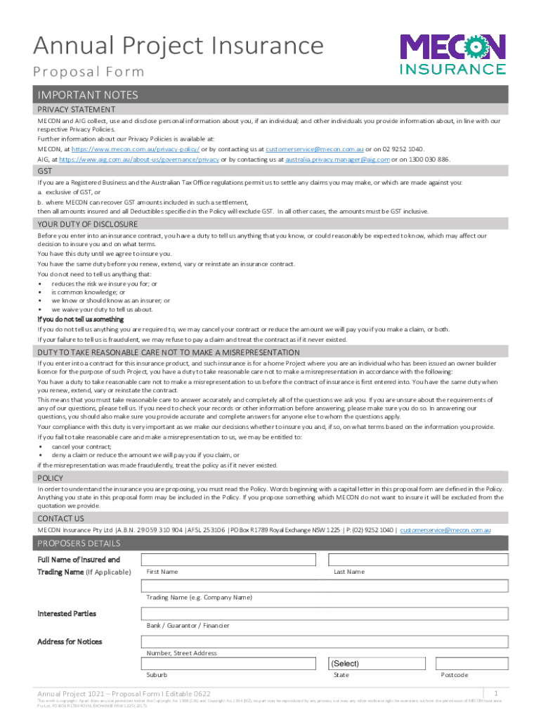 Get the free Annual Project - Proposal Form - MECON Insurance