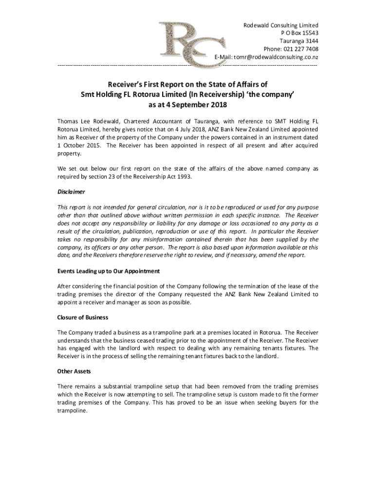 Get the free Receiver's First Report on the State of Affairs of Smt ... - rodewaldconsulting co