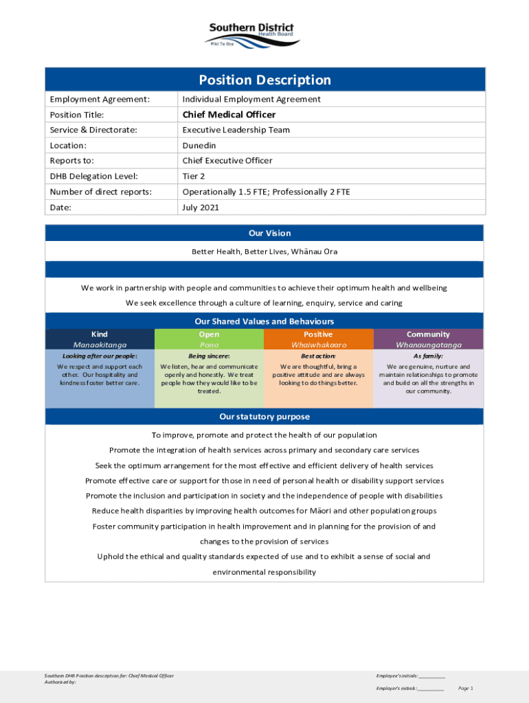 Position Description Employment Agreement:Individual Employment AgreementPosition Title:Chief Medical OfficerService & Directorate:Executive Leadership Reallocation:DunedinReports to:Chief Executive
