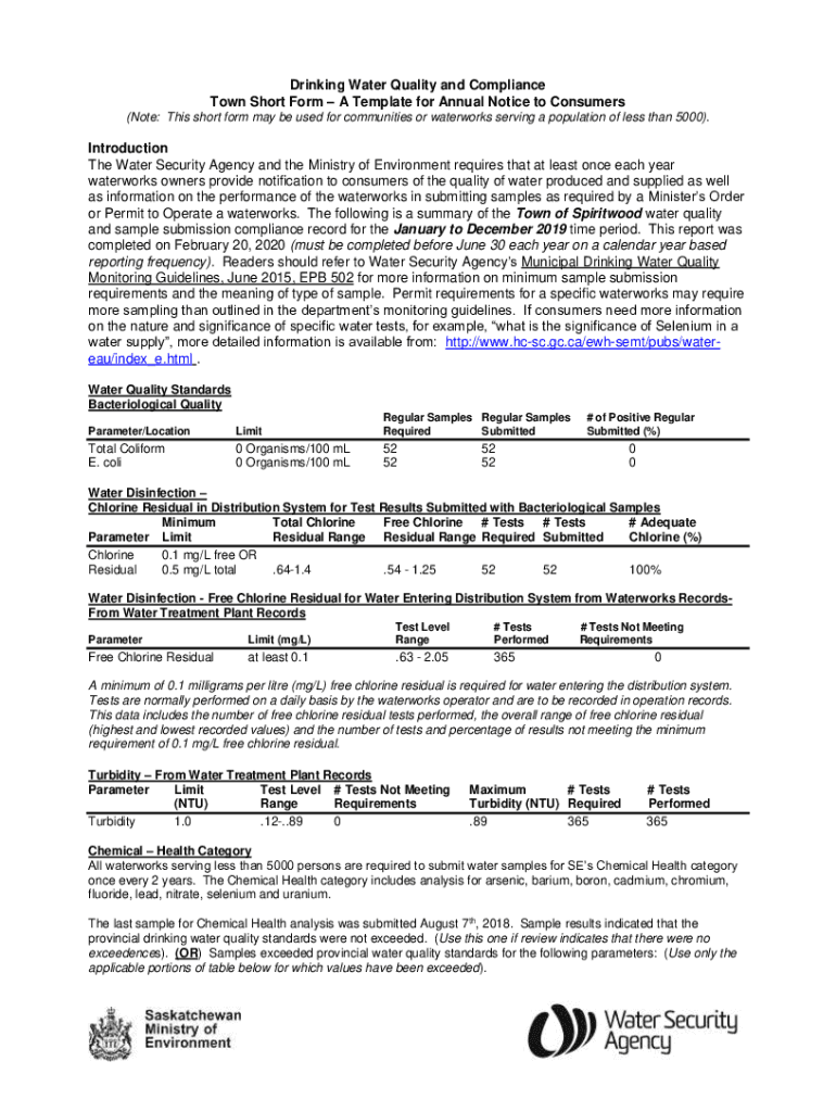 Drinking Water Quality and Compliance Town Short Form A Template for Annual Notice to Consumers (Note: This short form may be used for communities or waterworks serving a population of less than 5000).
