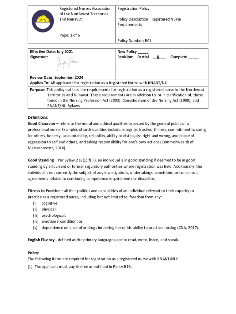 Registered Nurses Association of the Northwest Territories and NunavutRegistration Policy Description: Registered Nurse Requirements Page: 1 of 6 Policy Number: R01 Effective Date: July 2021 Signature:New