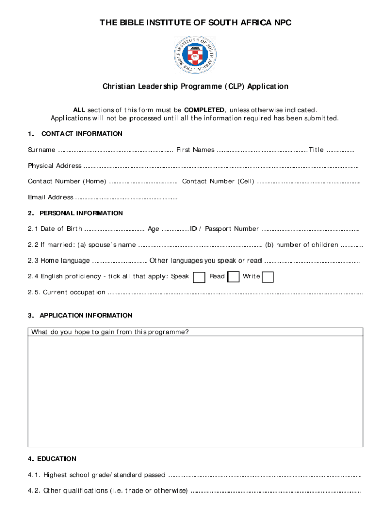 THE BIBLE INSTITUTE OF SOUTH AFRICA NPC Christian Leadership Program (CLP) Application ALL sections of this form must be COMPLETED, unless otherwise indicated. Applications will not be processed until