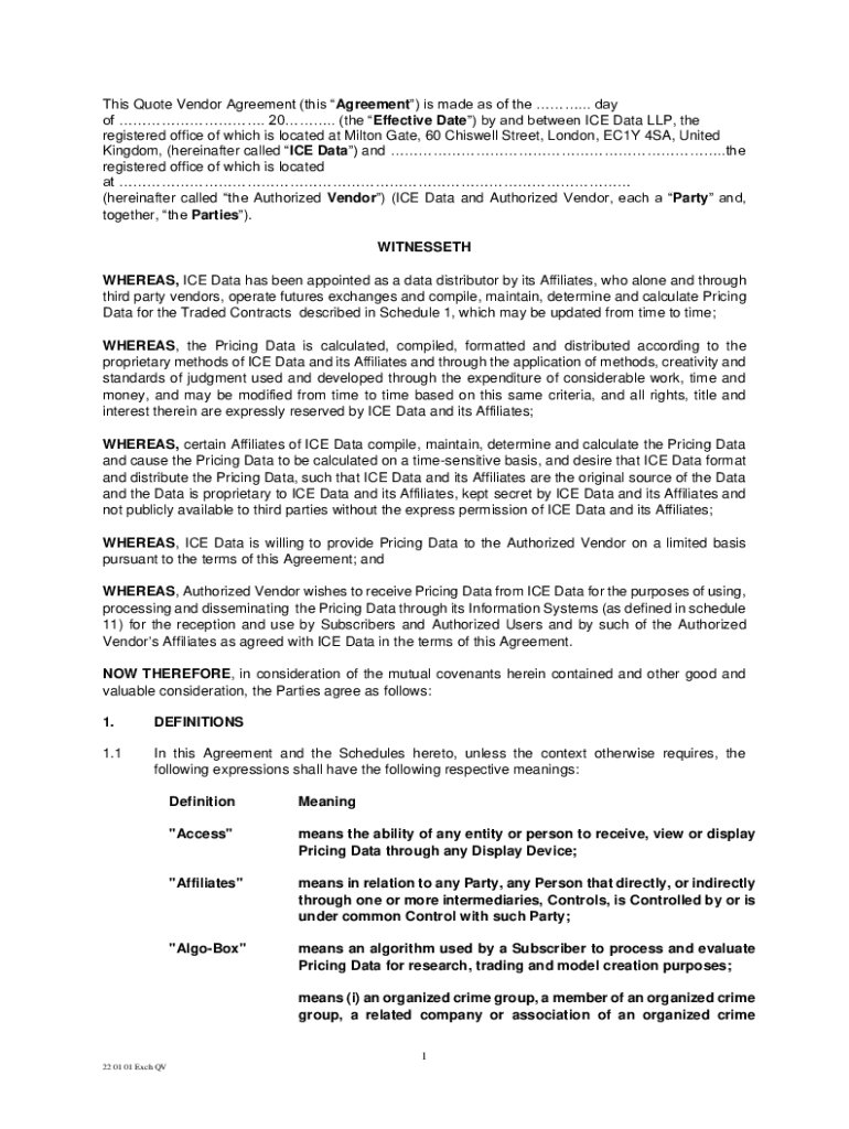 This Quote Vendor Agreement (this Agreement) is made as of the ... day of. 20. (the Effective Date) by and between ICE Data LLP, the registered office of which is located at Milton Gate, 60 Chi swell