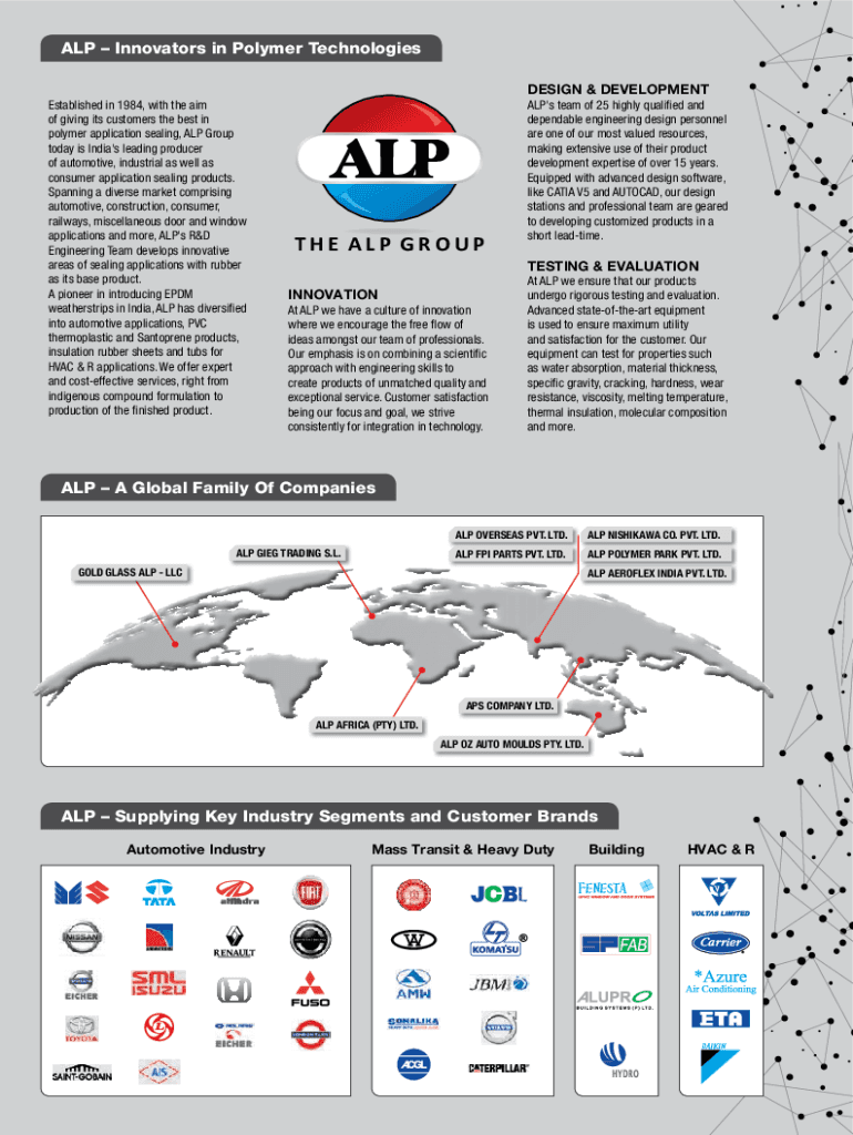ALP Innovators in Polymer Technologies DESIGN & DEVELOPMENT Established in 1984, with the aim of giving its customers the best in polymer application sealing, ALP Group today is India\'s leading producer