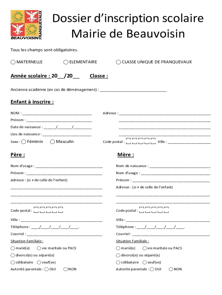 Les parents ou tuteurs légaux d'un enfant en âge d'être scolarisé ont besoin du dossier d'inscription scolaire pour l'inscrire à l'école auprès de la mairie.