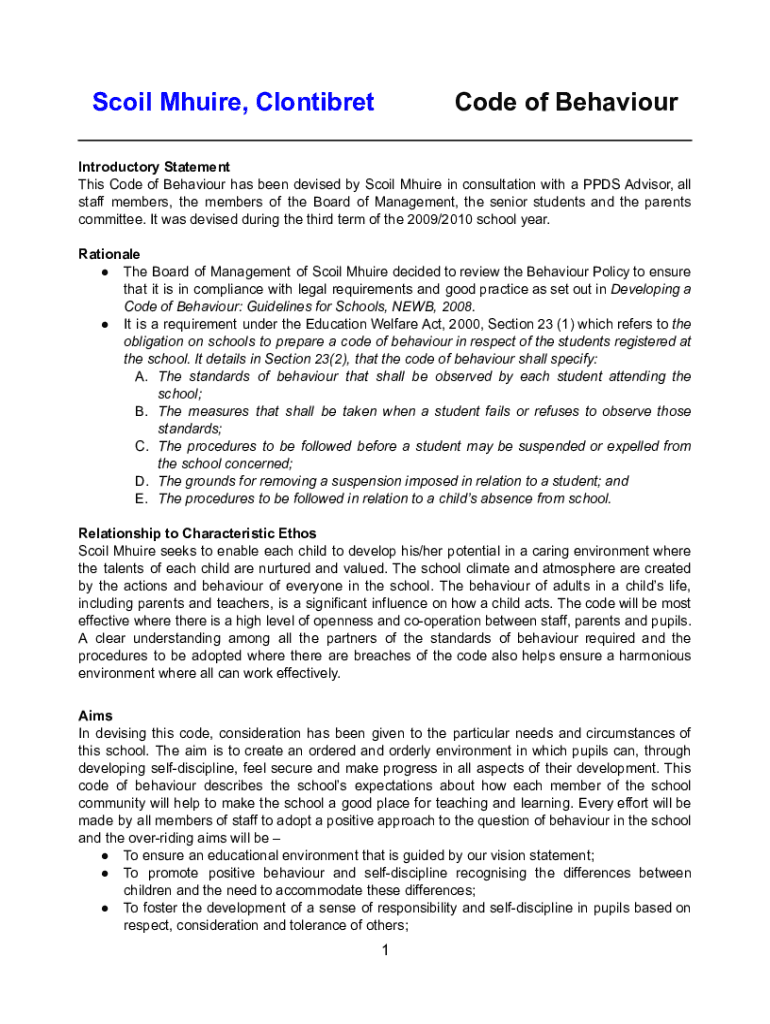 Soil Choose, ClontibretCode of BehaviourIntroductory Statement This Code of Behavior has been devised by Soil Choose in consultation with a PPDS Advisor, all staff members, the members of the Board