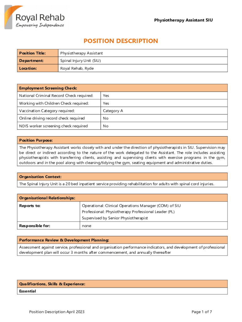 Physiotherapy Assistant DISPOSITION DESCRIPTION Position Title:Physiotherapy AssistantDepartment:Spinal Injury Unit (SIX)Location:Royal Rehab, Reemployment Screening Check: National Criminal Record