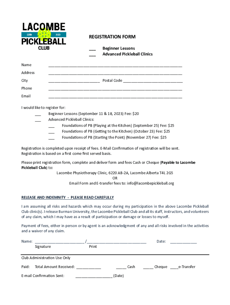 REGISTRATION FORM ___ ___Beginner Lessons Advanced Pickleball ClinicsName___Address___City___ Postal Code ___Phone___Email___I would like to register for: ___ Beginner Lessons (September 11 & 18,