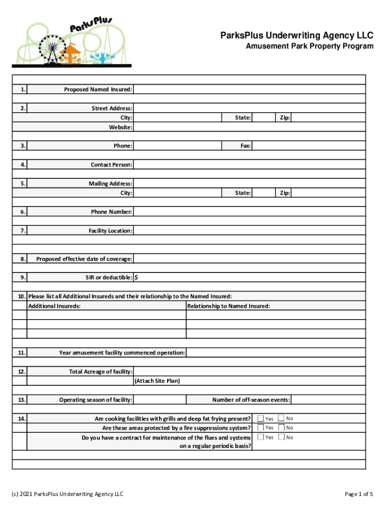 Parasols Underwriting Agency LLC Amusement Park Property Program1. Proposed Named Insured:2. Street Address: City: Website:State:3. Phone:Fax:4. Contact Person:5. Mailing Address: City:6. Phone Number:7.