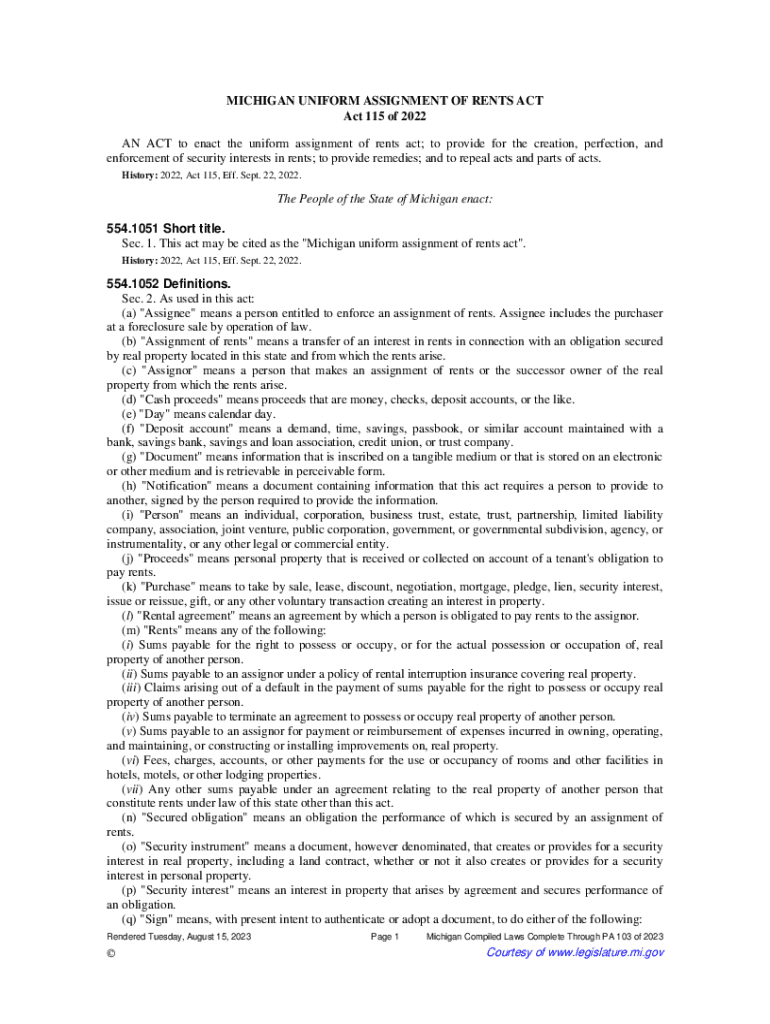 MICHIGAN UNIFORM ASSIGNMENT OF RENTS ACT 115 of 2022 AN ACT to enact the uniform assignment of rents act; to provide for the creation, perfection, and enforcement of security interests in rents; to