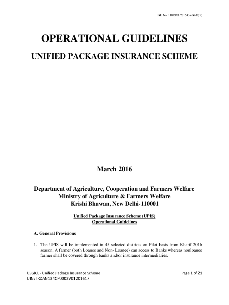 File No: 11019/01/2015CreditII(pt)OPERATIONAL GUIDELINES UNIFIED PACKAGE INSURANCE SCHEME March 2016 Department of Agriculture, Cooperation and Farmers Welfare Ministry of Agriculture & Farmers Welfare