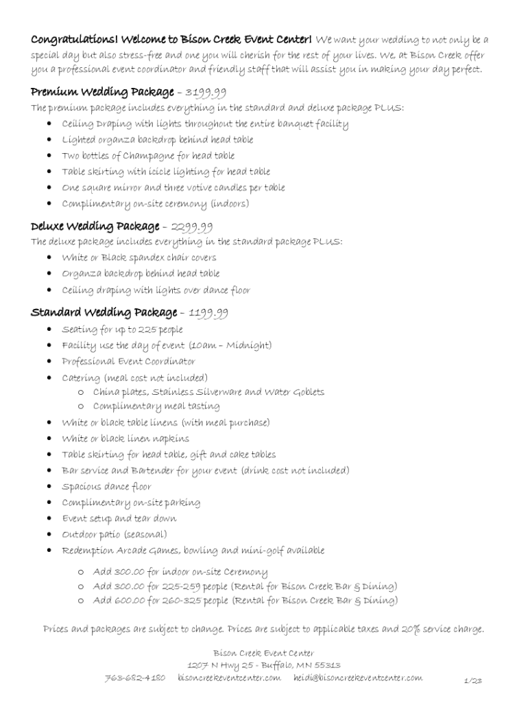 Congratulations! Welcome to Bison Creek Event Center! We want your wedding to not only be a special day but also stress free and one you will cherish for the rest of your lives. We, at Bison Creek