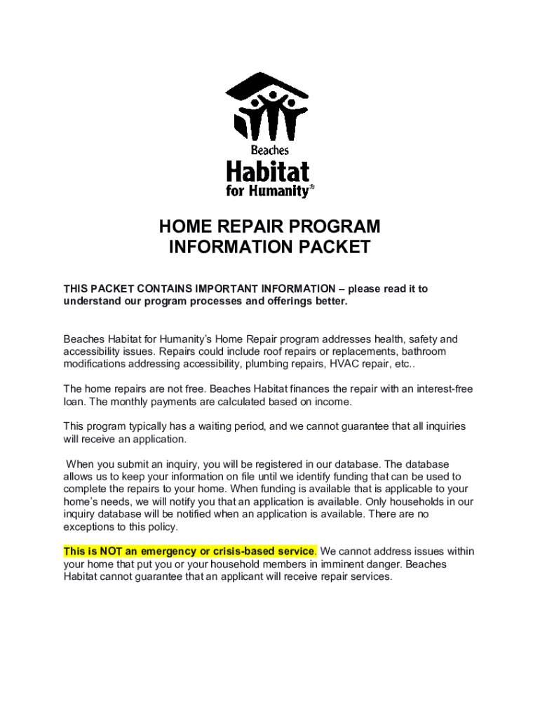 HOME REPAIR PROGRAM INFORMATION PACKET THIS PACKET CONTAINS IMPORTANT INFORMATION please read it to understand our program processes and offerings better. Beaches Habitat for Humanities Home Repair